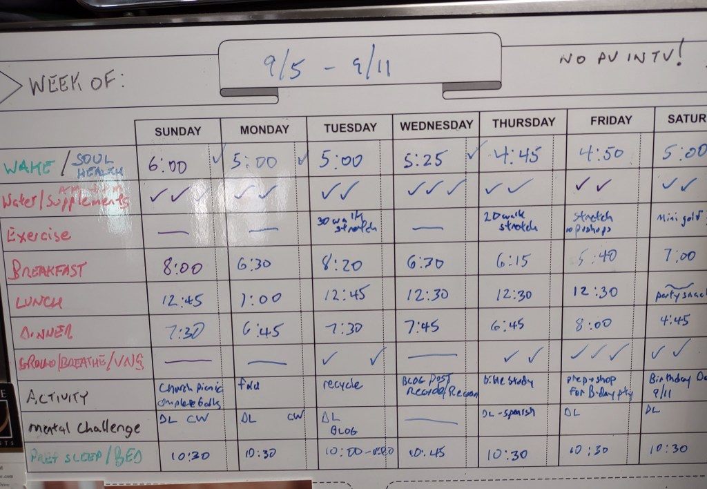 Then I track every day’s accomplishments and mealtimes on the main weekly chart as shown in the picture. A high bar of 13 possible points per day motivates me to get as many as I can. Has it kept me on track? Regretfully, I’m not 100%, but I know that I am closer to doing the right things than I would have been if I weren’t tracking.